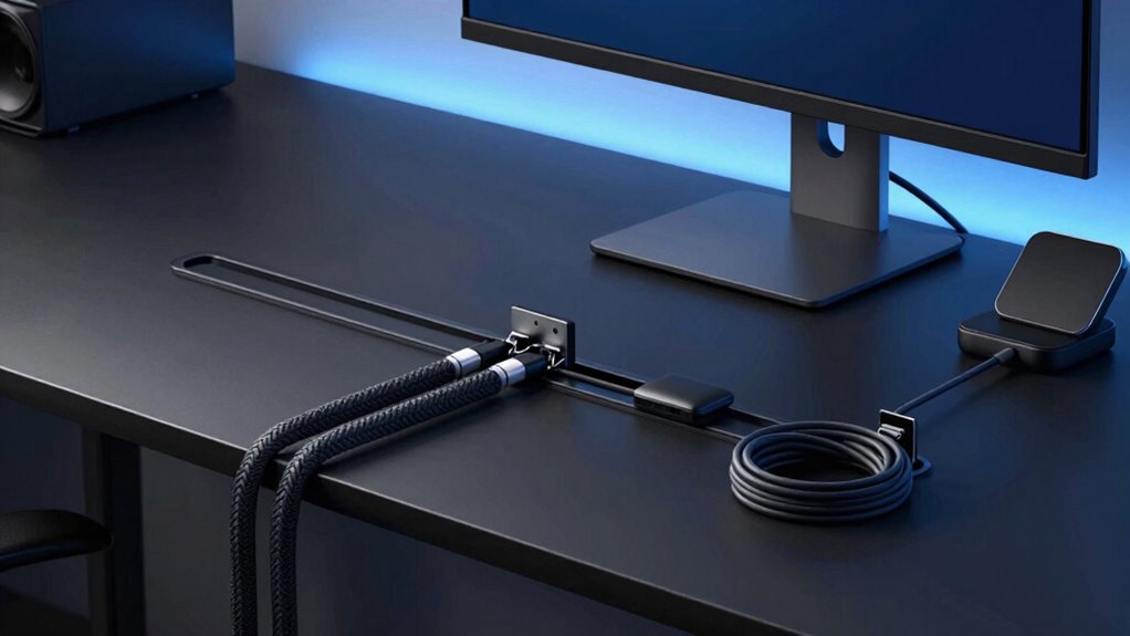Aesthetic integration plays a crucial role in choosing the right desk cable management system, especially for power users who want a clean and professional workspace. I look for solutions that blend seamlessly with my desk and office decor, ensuring cables don’t create visual clutter. Low-profile or flush-mounted options are my go-to, as they minimize disruptions and keep cables less noticeable. I also prefer color-matched organizers that harmonize with my workspace, making everything appear cohesive. Discreet designs like under-desk trays or cable raceways help conceal cables while maintaining a polished look. A well-designed system should organize effectively without sacrificing style, reducing distractions and supporting a sleek, professional environment. Ultimately, aesthetic integration keeps my workspace both functional and visually appealing.