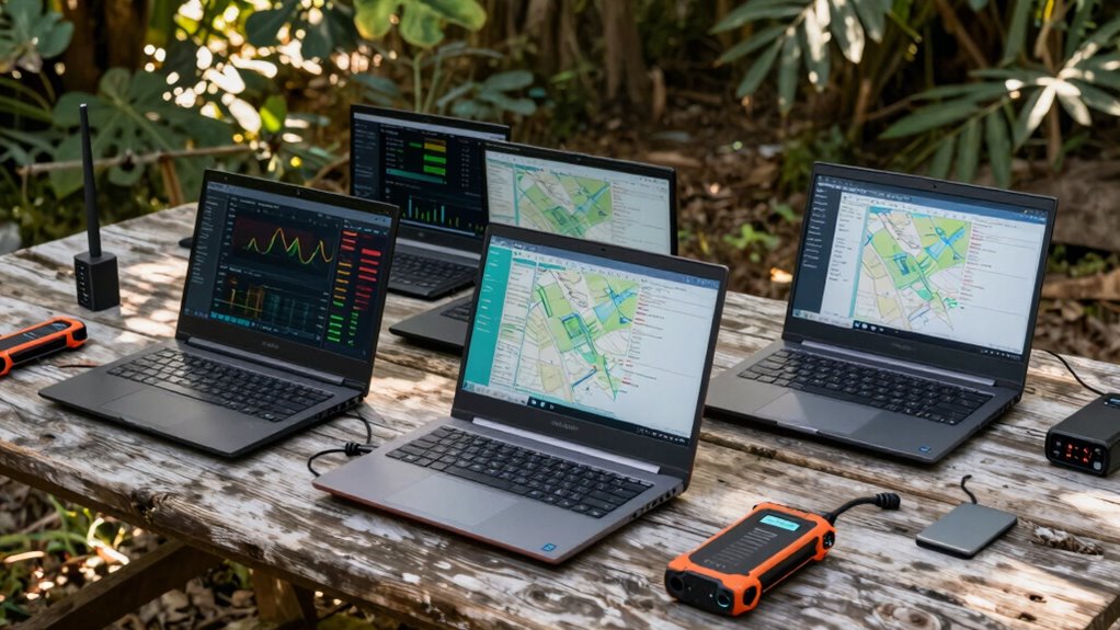 When choosing a field laptop for network diagnostics, I prioritize ruggedness and durability to withstand tough environments. I also consider screen visibility in outdoor settings, along with essential connectivity options to guarantee reliable communication. Finally, I evaluate performance, battery life, and portability to keep operations smooth and efficient in the field.